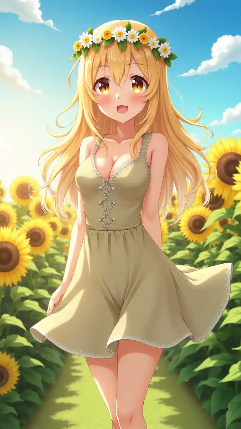 Vertical large-scale image of an Ultra HD anime girl, breathtakingly beautiful and cheerful, basking in the golden hour, standing in a sunflower field outdoors under a bright sky, wearing a summery dress with a plunging neckline and a flower crown, her long hair catching the light and a radiant smile, big shimmering eyes, glowing skin, sunny yellow and green color palette, soft features, perfect makeup, cheerful and vibrant vibes, soft glow and natural lighting, highlighting her charming, well-defined chest with a subtle cleavage, and long, toned legs with a relaxed pose, exuding beauty and joy.