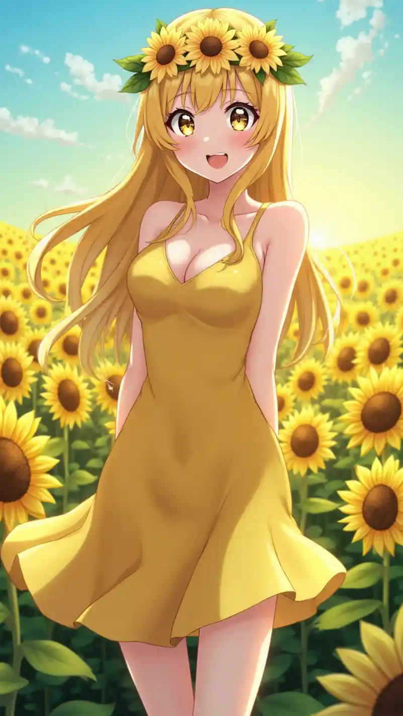 Vertical large-scale image of an Ultra HD anime girl, strikingly gorgeous and cheerful, basking in the golden hour, standing in a sunflower field outdoors under a bright sky, wearing a summery dress with a plunging neckline and a flower crown, her long hair catching the light and a radiant smile, wide shimmering eyes, glowing skin, sunny yellow and green color palette, soft features, perfect makeup, cheerful and vibrant vibes, soft glow and natural lighting, highlighting her captivating, well-defined chest with a subtle cleavage, and long, toned legs with a relaxed pose, exuding beauty and joy.