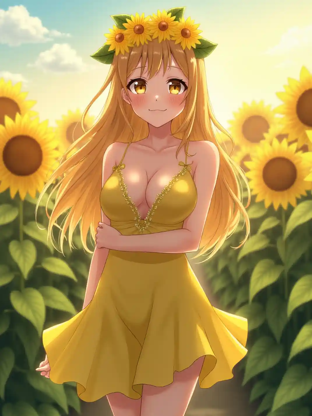 Vertical large-scale image of an Ultra HD anime girl, enchantingly beautiful and provocative, basking in the golden hour, standing in a sunflower field outdoors under a bright sky, wearing a summery dress with a plunging neckline and a flower crown, her long hair catching the light and a radiant smile, big shimmering eyes, glowing skin, sunny yellow and green color palette, soft features, perfect makeup, cheerful and vibrant vibes, soft glow and natural lighting, accentuating her enticing, well-defined chest with a subtle cleavage, and long, toned legs with a relaxed pose, exuding beauty and joy.