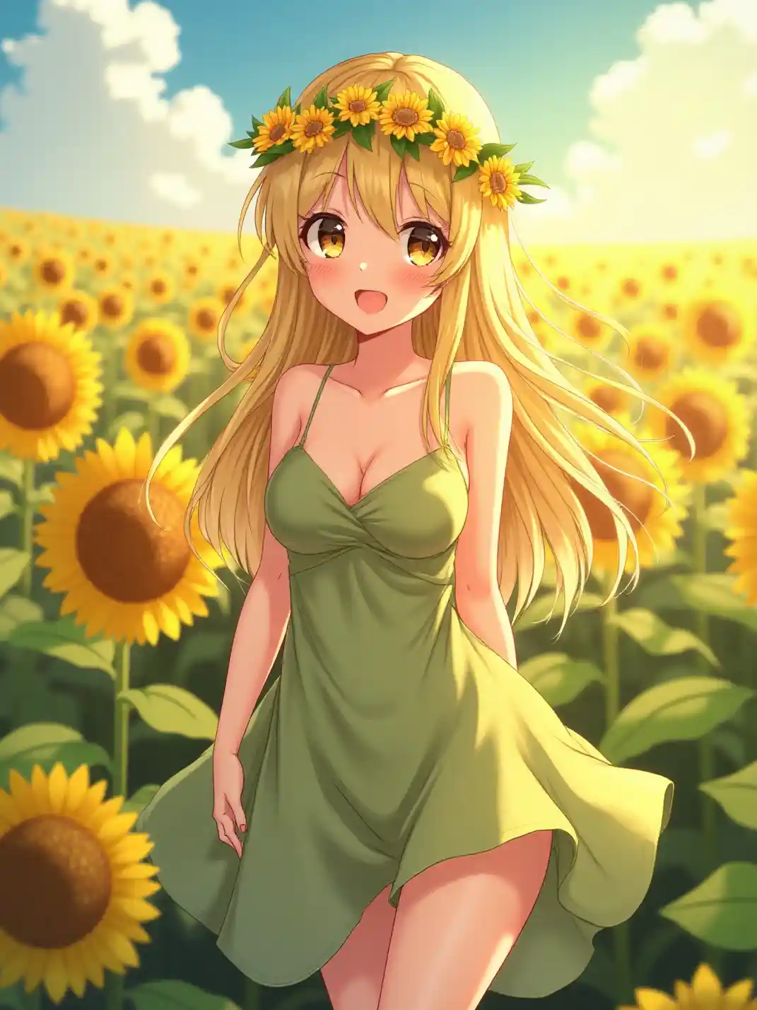 Vertical large-scale image of an Ultra HD anime girl, enchantingly beautiful and cheerful, basking in the golden hour, standing in a sunflower field outdoors under a bright sky, wearing a summery dress with a plunging neckline and a flower crown, her long hair catching the light and a radiant smile, big shimmering eyes, glowing skin, sunny yellow and green color palette, soft features, perfect makeup, cheerful and vibrant vibes, soft glow and natural lighting, accentuating her charming, well-defined chest with a subtle cleavage, and long, toned legs with a relaxed pose, exuding beauty and joy.
