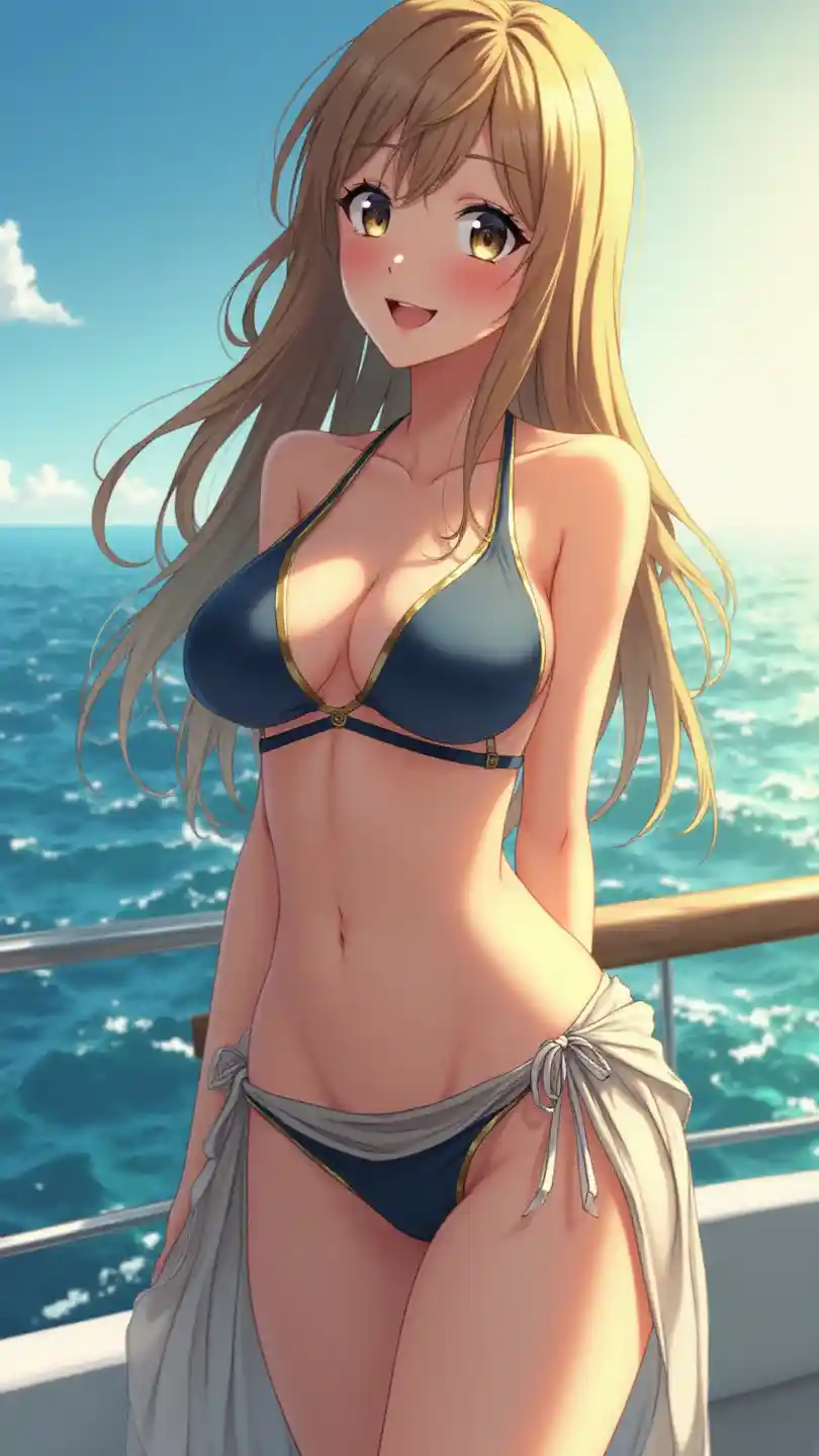 Vertical large-scale image of an Ultra HD anime girl, radiantly stunning and confident, basking in the sunlight, standing on a yacht in the middle of the ocean outdoors, wearing a luxurious bikini with a deep neckline and a sheer sarong, her long hair flowing in the sea breeze and a confident smile, wide sparkling eyes, glowing skin, warm blue and gold color palette, delicate features, perfect makeup, glamorous and adventurous vibes, soft glow and natural lighting, emphasizing her graceful, well-defined chest with a subtle cleavage, and long, toned legs with a relaxed pose, exuding beauty and confidence.