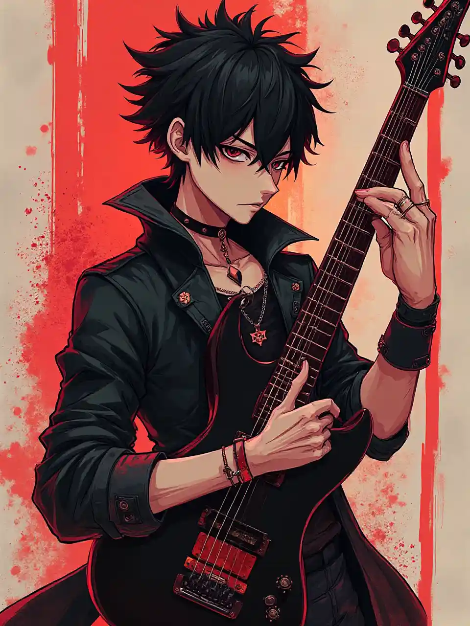 A picture of a stoic Drypoint anime boy holding a sleek guitar, rock music reference, edgy spikes and punk-inspired wristband, dark black hair, and cool attitude, Davinci drawing style, mysterious and captivating focus portrait, neon red and hot black --ar 9:16 --q 2 --niji 5