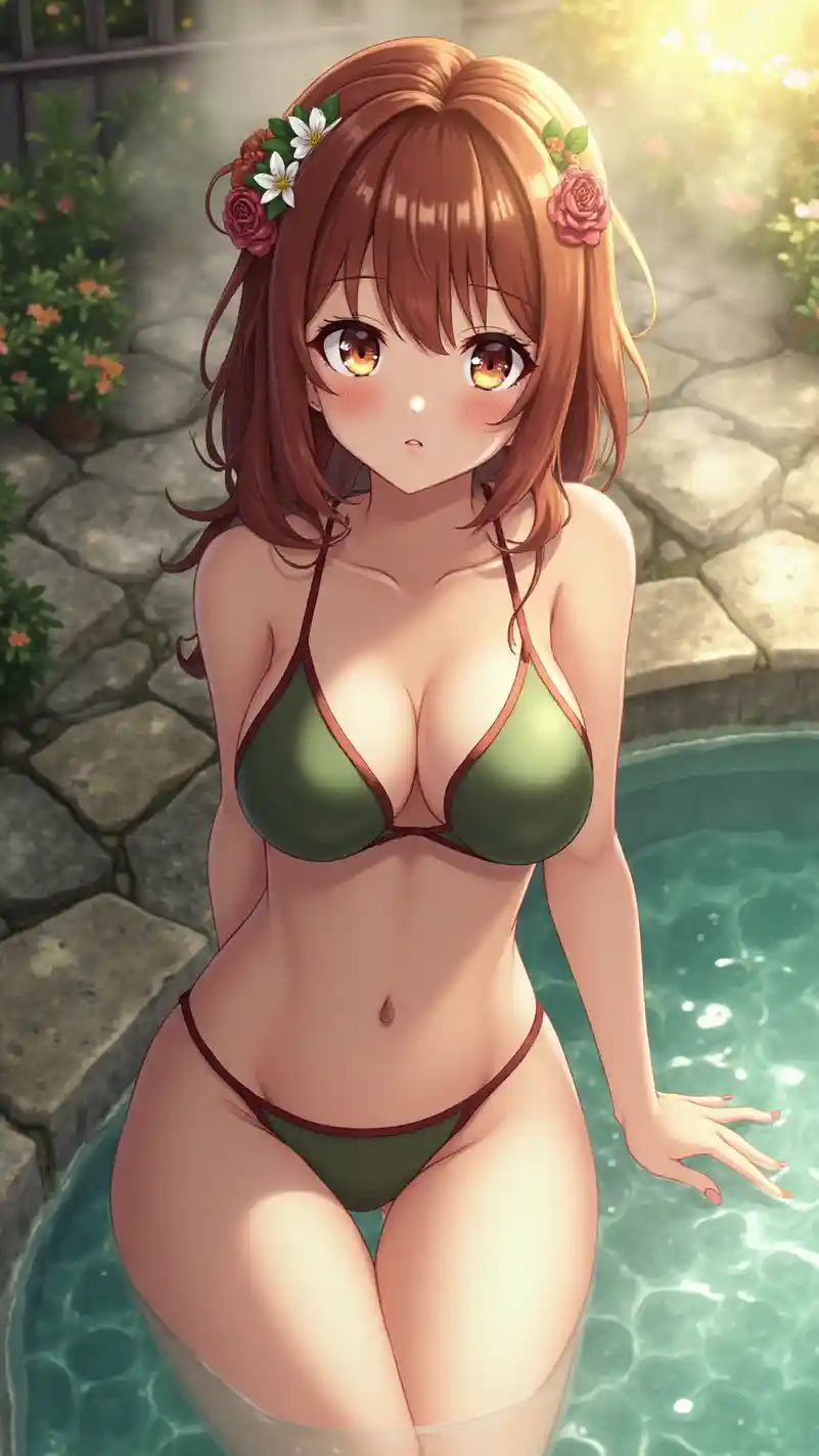 Vertical large-scale image of an Ultra HD anime girl, radiantly stunning and serene, basking in the sunlight, lounging by an outdoor hot spring with steam rising, wearing a revealing swimsuit with a deep neckline and a floral hairpiece, her wet hair clinging to her skin and a confident smile, wide sparkling eyes, glowing skin, warm red and green color palette, delicate features, perfect makeup, serene and exotic vibes, soft glow and natural lighting, emphasizing her graceful, well-defined chest with a subtle cleavage, and long, toned legs with a relaxed pose, exuding beauty and tranquility.