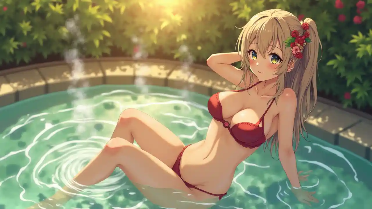 Horizontal large-scale image of an Ultra HD anime girl, enchantingly beautiful and serene, basking in the sunlight, lounging by an outdoor hot spring with steam rising, wearing a revealing swimsuit with a deep neckline and a floral hairpiece, her wet hair clinging to her skin and a confident smile, big shimmering eyes, glowing skin, warm red and green color palette, soft features, perfect makeup, serene and exotic vibes, soft glow and natural lighting, accentuating her charming, well-defined chest with a subtle cleavage, and long, toned legs with a relaxed pose, exuding beauty and tranquility.