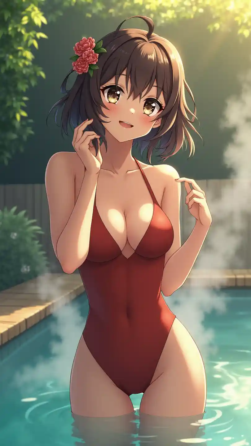 Vertical large-scale image of an Ultra HD anime girl, strikingly gorgeous and alluring, basking in the sunlight, lounging by an outdoor hot spring with steam rising, wearing a revealing swimsuit with a deep neckline and a floral hairpiece, her wet hair clinging to her skin and a confident smile, wide shimmering eyes, glowing skin, warm red and green color palette, sharp features, perfect makeup, serene and exotic vibes, soft glow and natural lighting, showcasing her captivating, well-defined chest with a subtle cleavage, and long, toned legs with a relaxed pose, exuding beauty and tranquility.