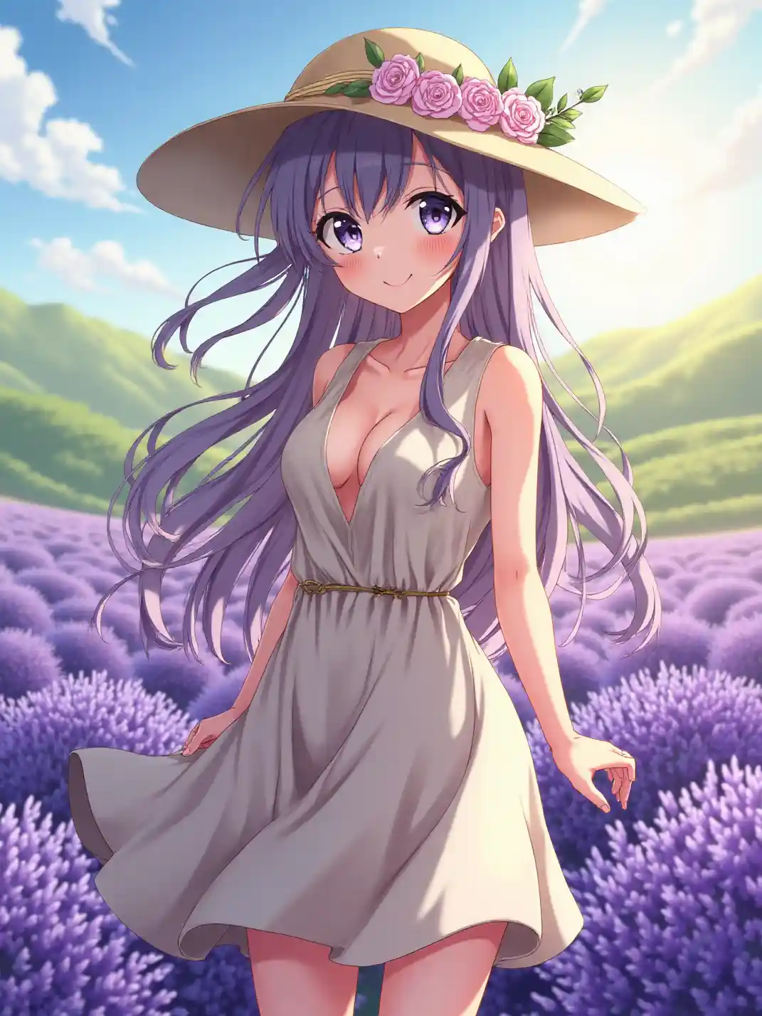 Vertical large-scale image of an Ultra HD anime girl, breathtakingly gorgeous and seductive, basking in the morning sun, standing in a lavender field outdoors with rolling hills, wearing a summery dress with a plunging neckline and a wide-brim hat, her long hair adorned with flowers and a radiant smile, big shimmering eyes, glowing skin, soft purple and green color palette, refined features, perfect makeup, serene and romantic vibes, soft glow and natural lighting, highlighting her voluptuous, well-defined chest with a subtle cleavage, and long, toned legs with a graceful stance, exuding beauty and charm.