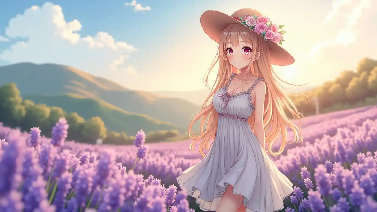 Horizontal large-scale image of an Ultra HD anime girl, breathtakingly beautiful and romantic, basking in the morning sun, standing in a lavender field outdoors with rolling hills, wearing a summery dress with a plunging neckline and a wide-brim hat, her long hair adorned with flowers and a radiant smile, wide sparkling eyes, glowing skin, soft purple and green color palette, refined features, perfect makeup, serene and romantic vibes, soft glow and natural lighting, emphasizing her graceful, well-defined chest with a subtle cleavage, and long, toned legs with a graceful stance, exuding beauty and charm.