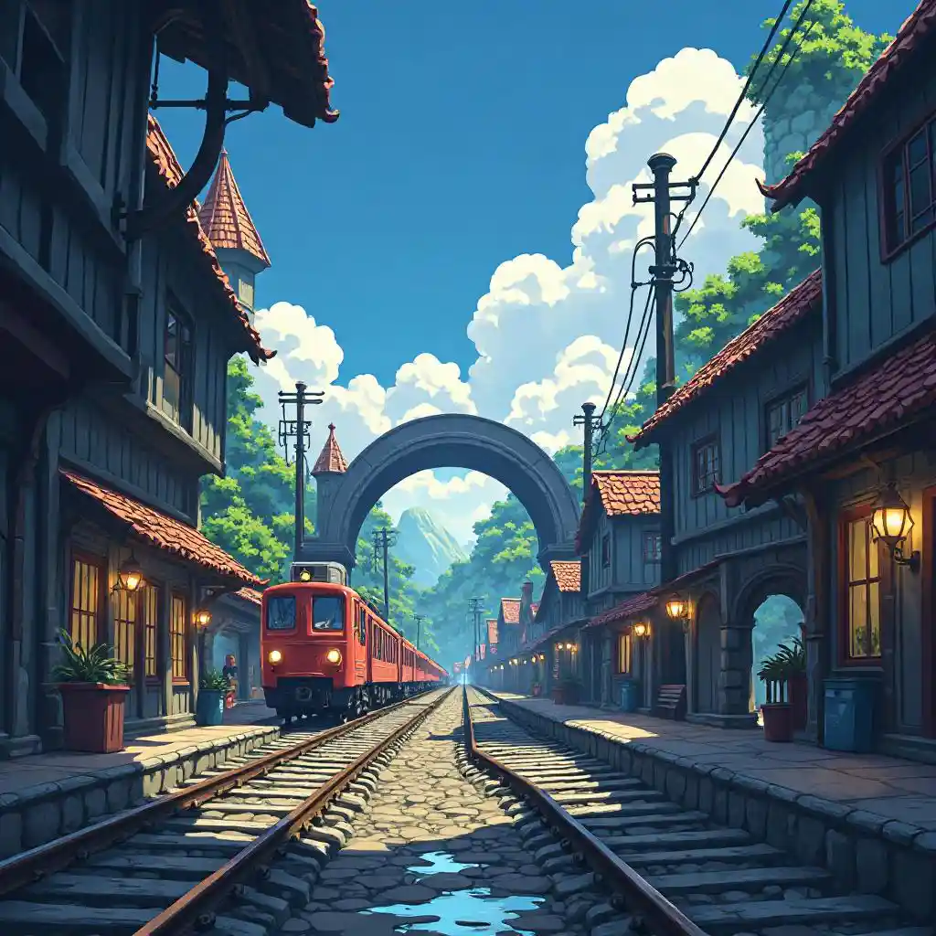 BraydenBustling train station, portals to different realms, in the style of adventure anime.