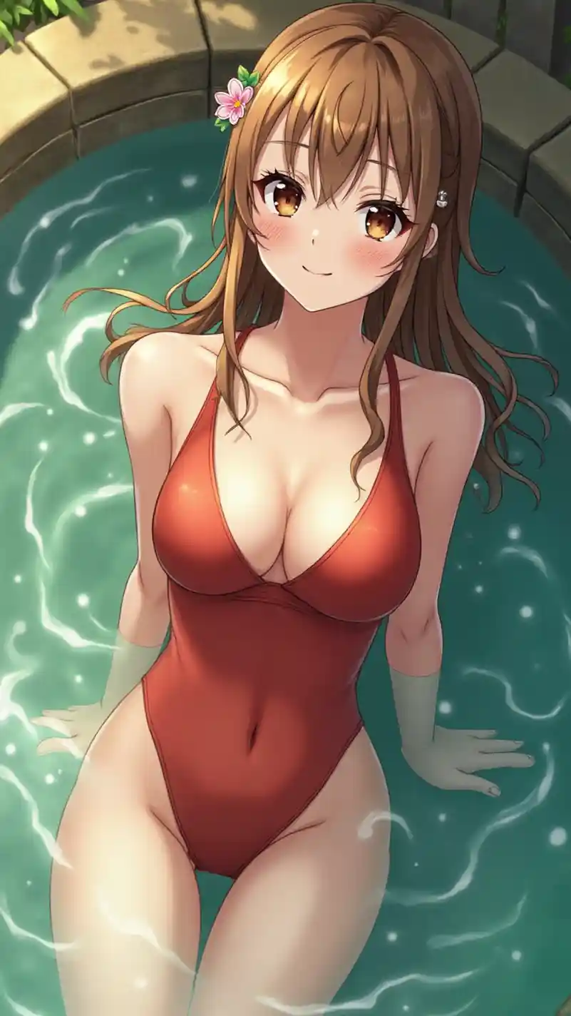Vertical large-scale image of an Ultra HD anime girl, breathtakingly gorgeous and serene, basking in the sunlight, lounging by an outdoor hot spring with steam rising, wearing a revealing swimsuit with a deep neckline and a floral hairpiece, her wet hair clinging to her skin and a confident smile, big shimmering eyes, glowing skin, warm red and green color palette, refined features, perfect makeup, serene and exotic vibes, soft glow and natural lighting, emphasizing her graceful, well-defined chest with a subtle cleavage, and long, toned legs with a relaxed pose, exuding beauty and tranquility.