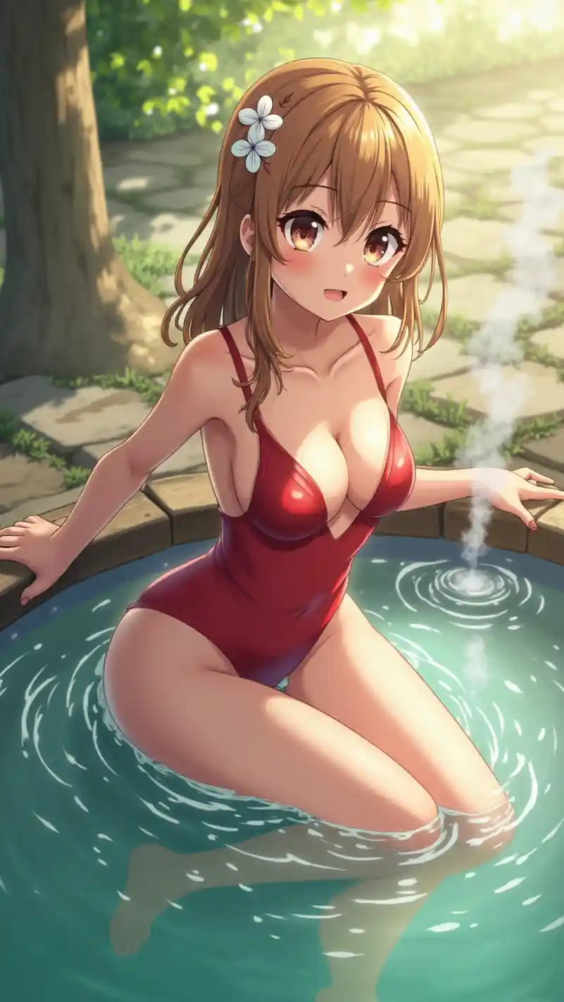 Vertical large-scale image of an Ultra HD anime girl, radiantly stunning and serene, basking in the sunlight, lounging by an outdoor hot spring with steam rising, wearing a revealing swimsuit with a deep neckline and a floral hairpiece, her wet hair clinging to her skin and a confident smile, wide sparkling eyes, glowing skin, warm red and green color palette, delicate features, perfect makeup, serene and exotic vibes, soft glow and natural lighting, emphasizing her graceful, well-defined chest with a subtle cleavage, and long, toned legs with a relaxed pose, exuding beauty and tranquility.