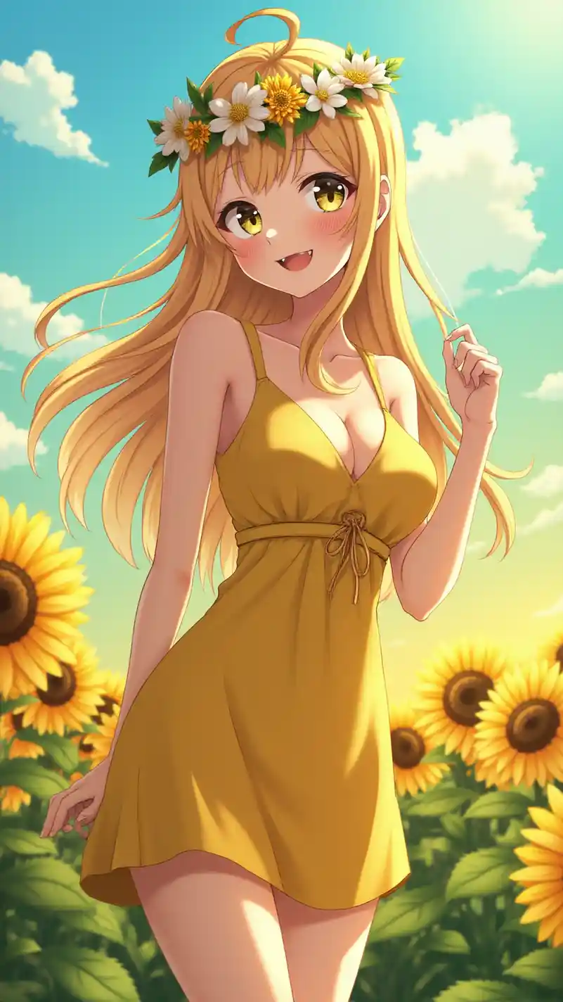 Vertical large-scale image of an Ultra HD anime girl, enchantingly beautiful and provocative, basking in the golden hour, standing in a sunflower field outdoors under a bright sky, wearing a summery dress with a plunging neckline and a flower crown, her long hair catching the light and a radiant smile, wide shimmering eyes, glowing skin, sunny yellow and green color palette, soft features, perfect makeup, cheerful and vibrant vibes, soft glow and natural lighting, accentuating her enticing, well-defined chest with a subtle cleavage, and long, toned legs with a relaxed pose, exuding beauty and joy.