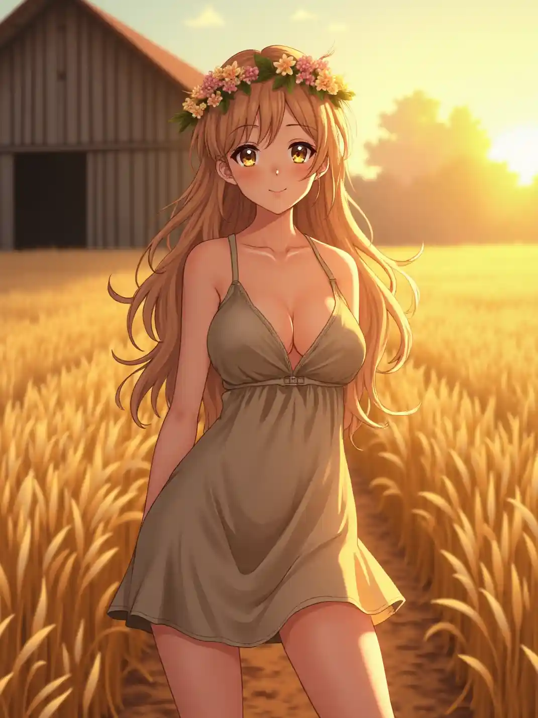 Vertical large-scale image of an Ultra HD anime girl, radiantly beautiful and sensual, basking in the golden hour, standing in a wheat field outdoors with a rustic barn in the background, wearing a boho sundress with a plunging neckline and a flower crown, her long hair catching the light and a radiant smile, big shimmering eyes, glowing skin, warm gold and brown color palette, elegant features, perfect makeup, serene and dreamy vibes, soft glow and natural lighting, emphasizing her alluring, well-defined chest with a subtle cleavage, and long, toned legs with a relaxed pose, exuding beauty and charm.