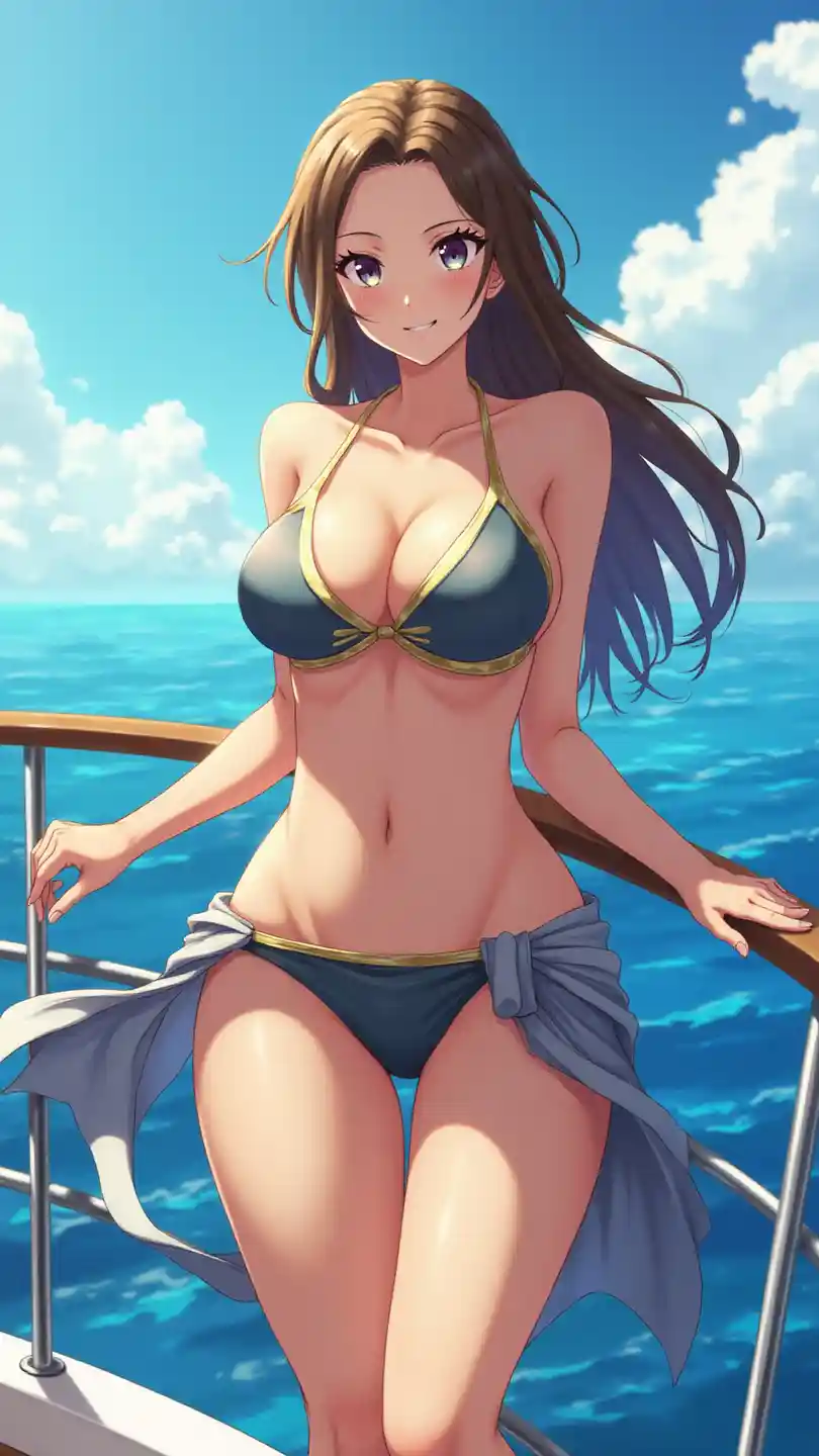 Vertical large-scale image of an Ultra HD anime girl, enchantingly beautiful and confident, basking in the sunlight, standing on a yacht in the middle of the ocean outdoors, wearing a luxurious bikini with a deep neckline and a sheer sarong, her long hair flowing in the sea breeze and a confident smile, big shimmering eyes, glowing skin, warm blue and gold color palette, soft features, perfect makeup, glamorous and adventurous vibes, soft glow and natural lighting, accentuating her charming, well-defined chest with a subtle cleavage, and long, toned legs with a relaxed pose, exuding beauty and confidence.