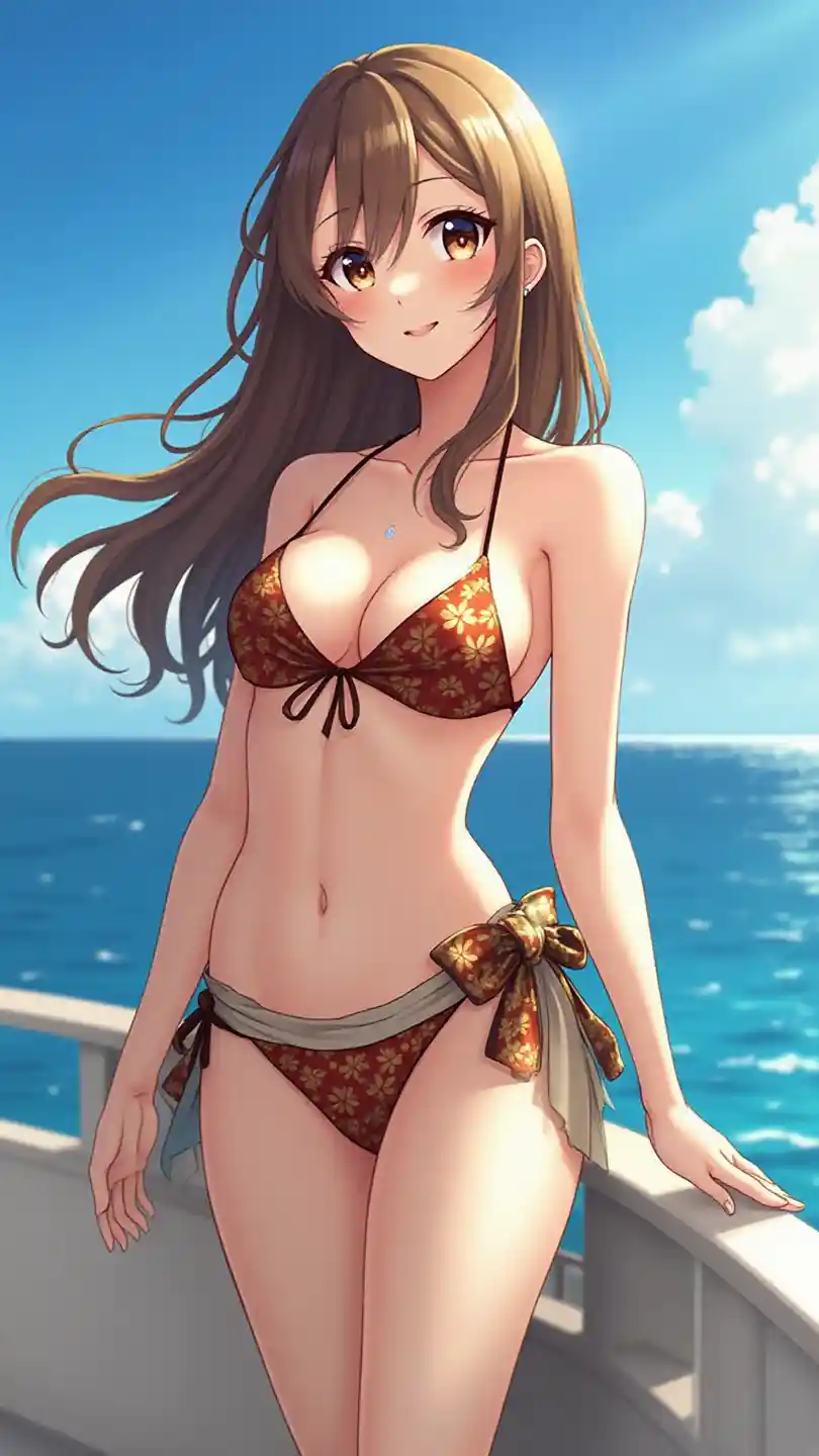 Vertical large-scale image of an Ultra HD anime girl, radiantly stunning and confident, basking in the sunlight, standing on a yacht in the middle of the ocean outdoors, wearing a luxurious bikini with a deep neckline and a sheer sarong, her long hair flowing in the sea breeze and a confident smile, big shimmering eyes, glowing skin, warm blue and gold color palette, delicate features, perfect makeup, glamorous and adventurous vibes, soft glow and natural lighting, emphasizing her graceful, well-defined chest with a subtle cleavage, and long, toned legs with a relaxed pose, exuding beauty and confidence.