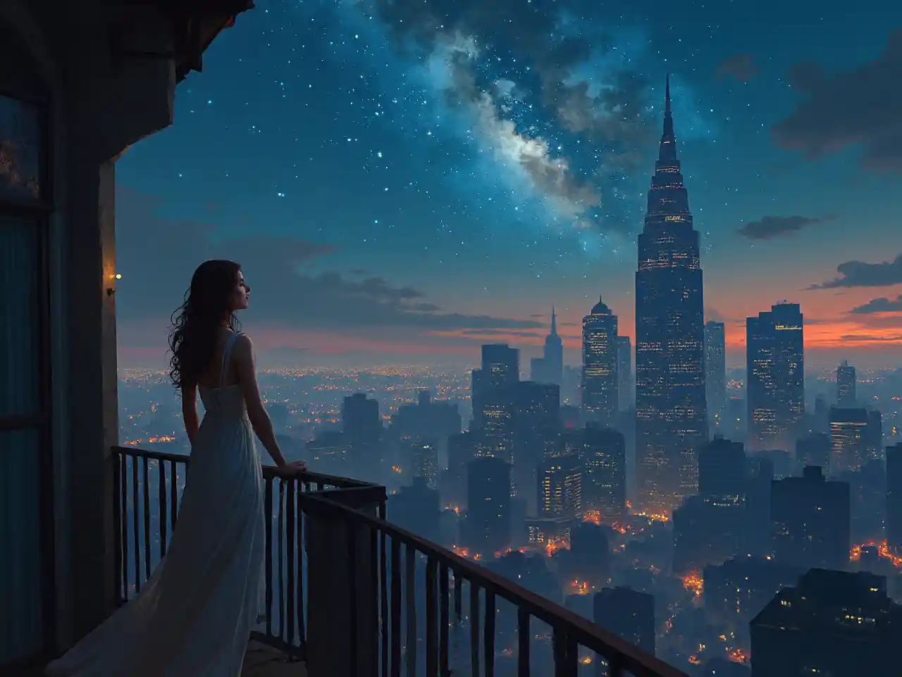 a woman in a dress on a balcony looking at the stars in the sky above a cityscape with a skyscrapers in the background, Anna Dittmann, fantasy art, highly detailed digital painting, an airbrush painting