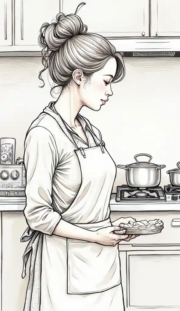 (A woman wearing an apron :1.5), detailed illustration, Breathtakingly Beautiful Art , Detailed Line Art, super quality, Mr.々in a kitchen neatly lined with con