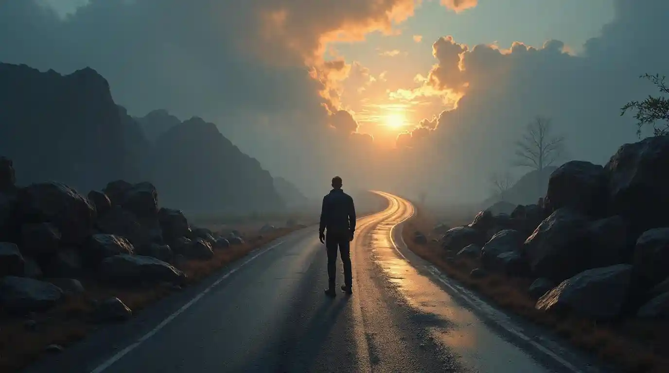 a man in front of a road full of curves, the image should simulate a great journey Arcane style Emphasis on moody lighting and intricate details, sense of depth and atmosphere using textured brushstrokes