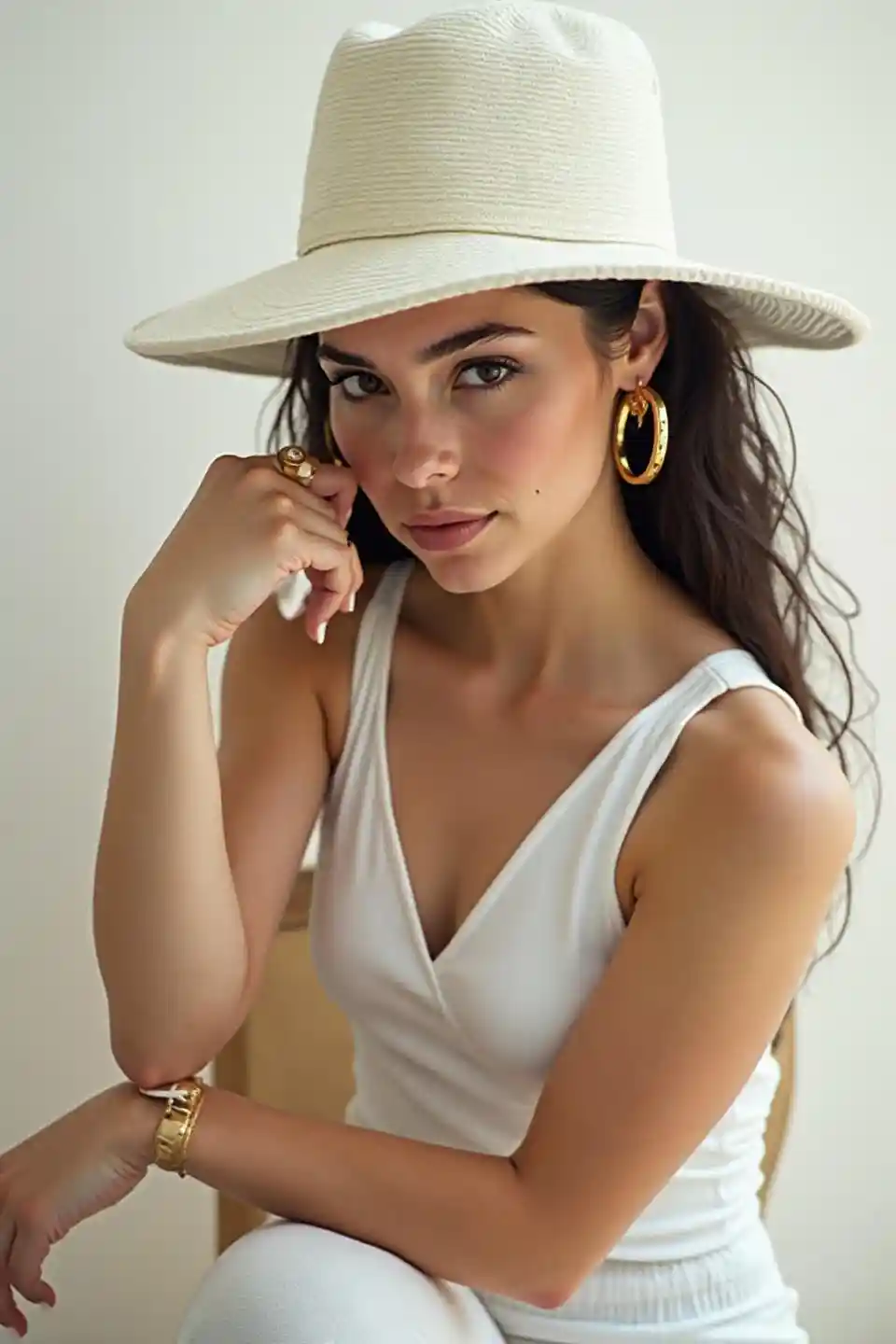 Archer Pose with White Hat and Gold Hoops