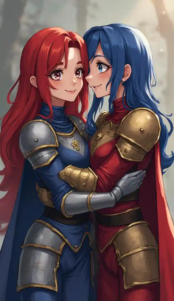AubreyPretty Girl with Red Hair in Red Armor Knight,Beautiful Girl with Blue Hair in Blue Armor,Hug each other,happy smile,Exquisite Details,high resolution launched,