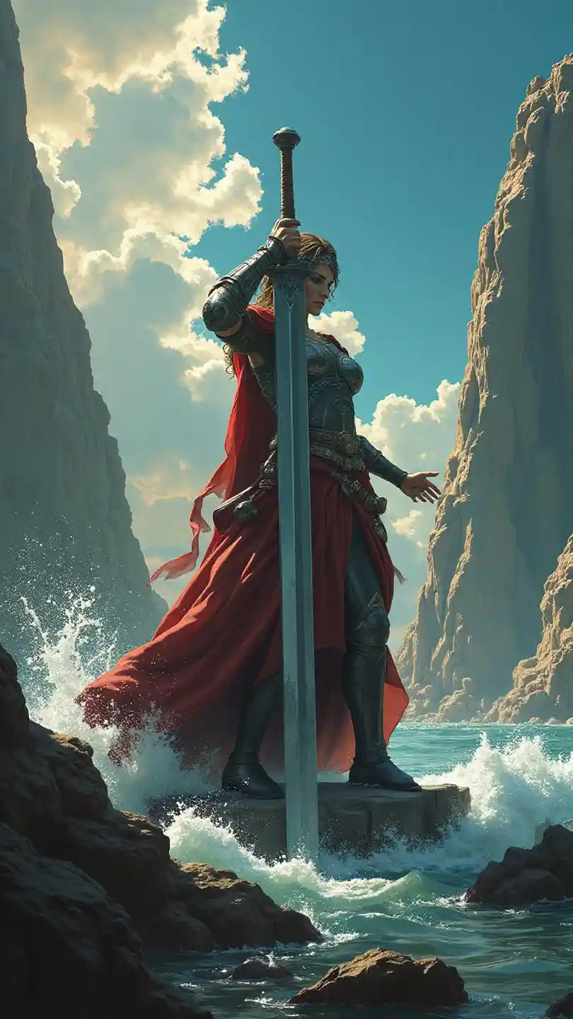 Woman in Armor Splits River with Giant Sword