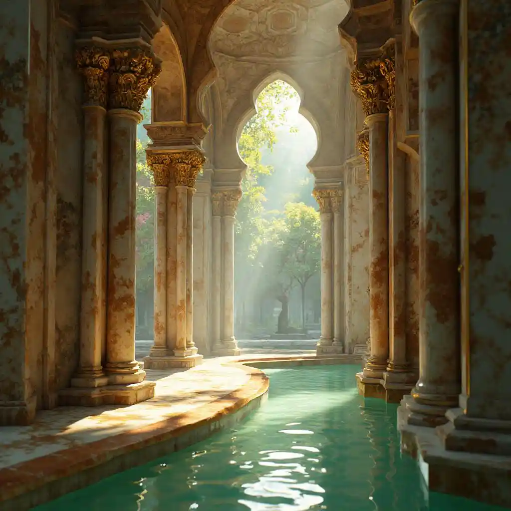 Ornate and intricate wood craftsmanship. Sunlight breaking through marble, pearl, emerald, gold, silver and jade. specular highlights, , HDR, indirect lighting, reflections, refractions, translucid, tranquil setting, , caustics .