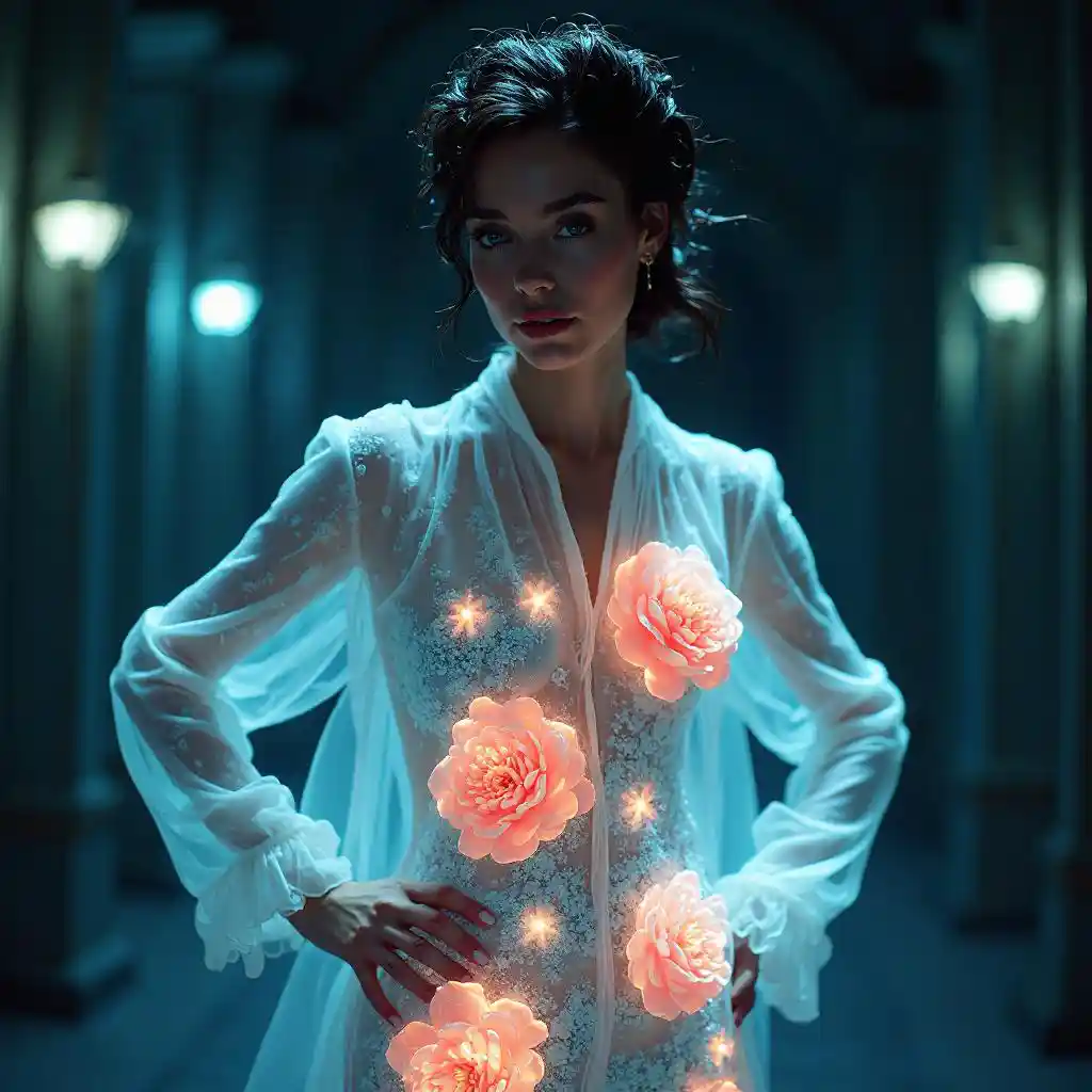 volumetric lighting radiating sophisticated chic in the man ray style, professional kodak supra endura vc 800 photographic film, a valuable photograph depicting a striking woman with well-defined cheekbones, full lips and captivating eyes, in an elegant outfit, made in an editorial setting using impasto drawings, 8K sigma resolution 70-200 mm, creating an exquisite and artistic atmosphere with a touch of mystery, 3/4 portrait, bioluminescent sketch, voluptuous body in large sizes, flowers inside the transparent body of the model, a beautiful transparent woman made of transparent glass filled with neon peonies inside, frosty patterns on transparent glass, beautiful pose, hands on the belt, overdetalization, glare enhancement, computer graphics, snowflakes,