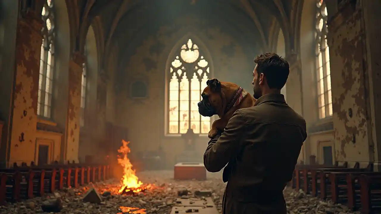 a man holding a English bulldog in a destroyed vaulted ceiling English church with broken large stained glass windows and a plane on fire in the background and a fire pit in the foreground, Artur Tarnowski, neo-romanticism, cinematic photography, a photorealistic painting