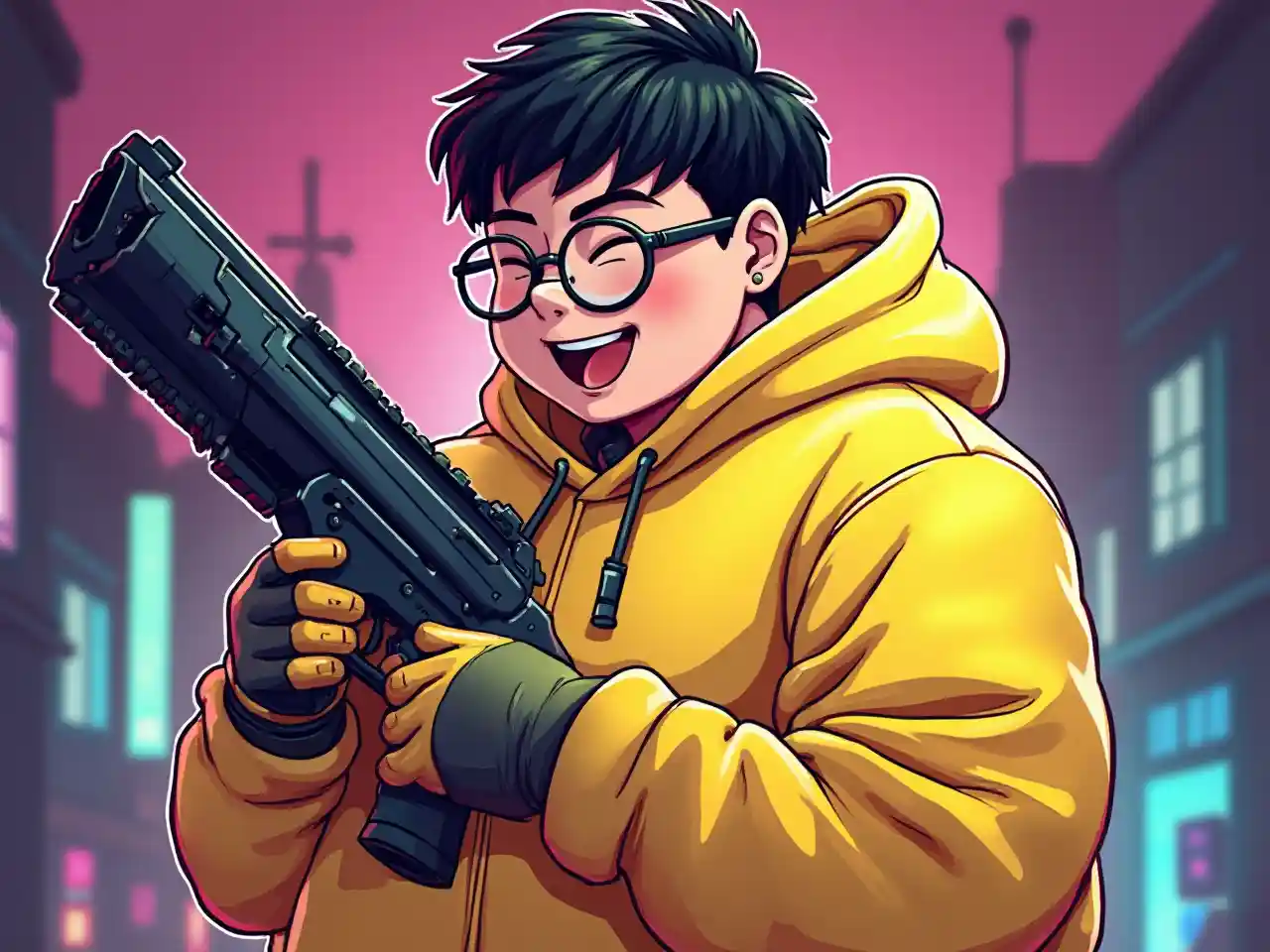 (pixel art), detailed, Yellow Hoodie, gloves,round glasses, action pose, vaporwave neon theme, Chubby Asian Boy,Fat,portrait, smile, laugh, (upper body, bust shot, looking away:1.1),Bowl cut hair,big Gun