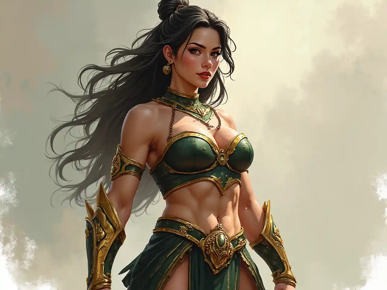 Draw very buff asian Amazon warrior women with jagged obsidian and gold metal armor