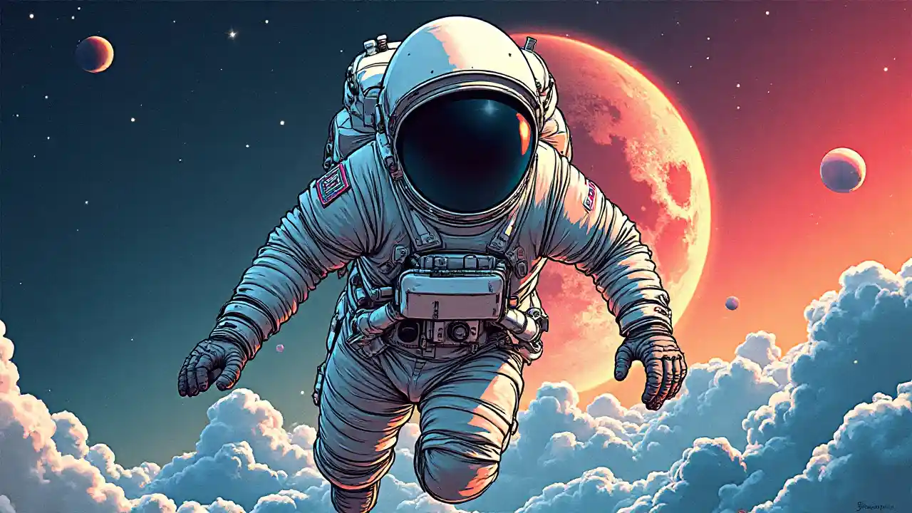 Astronaut comic art, comic book cover art, photorealistic ink art, techno sci fi, maximalist surrealism