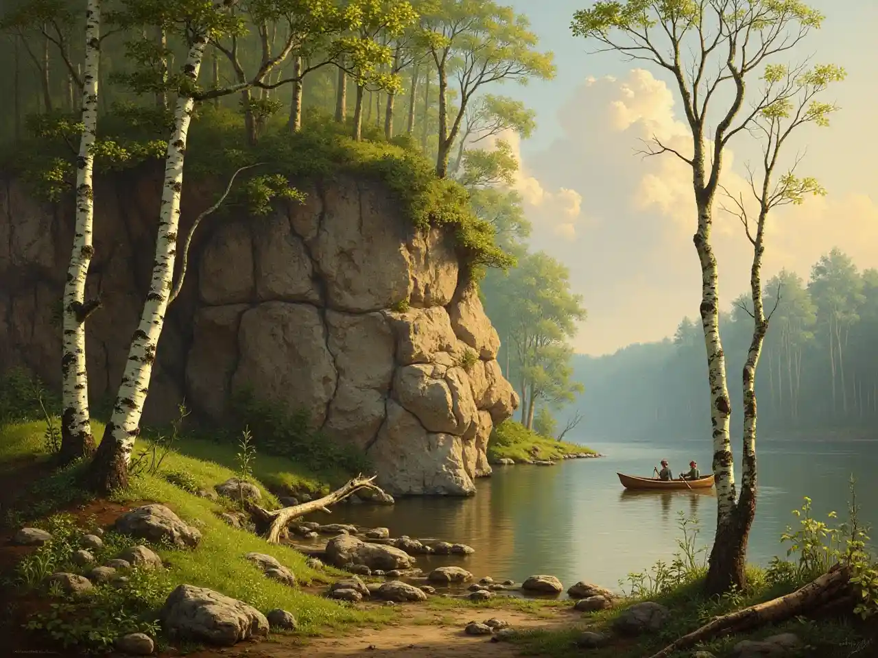 A detailed and atmospheric landscape likely in the style of 19th-century realism. The scene portrays a tranquil forested area with a rocky cliff, a calm body of water, and a soft, diffused light creating depth and warmth. The foreground is rich with vegetation, including lush green grass, moss, and small plants growing among scattered rocks and fallen branches. There are a few slender birch trees with white, textured bark, their delicate trunks curving slightly as they reach upward. The ground appears slightly damp and shaded, with patches of sunlight filtering through the dense canopy of trees. The middle of the landscape features a prominent rock formation—large, rugged cliffs with earthy tones of brown, gray, and hints of red. The rocks are partially covered with greenery, and some areas appear weathered or eroded. A fallen tree trunk rests against the rocks, adding a natural element of decay and renewal. To the left, a break in the tree line opens to a calm lake or river. Two figures in a small wooden boat are paddling across the water, dressed in simple clothing. Their presence gives a sense of scale to the landscape and adds a human element to the otherwise untouched wilderness. The background consists of a distant tree line bathed in soft, golden light, suggesting either early morning or late afternoon. The sky is painted with subtle hues of blue and light clouds, giving a serene and peaceful atmosphere. The trees in the distance are slightly blurred, adding a sense of depth and realism.