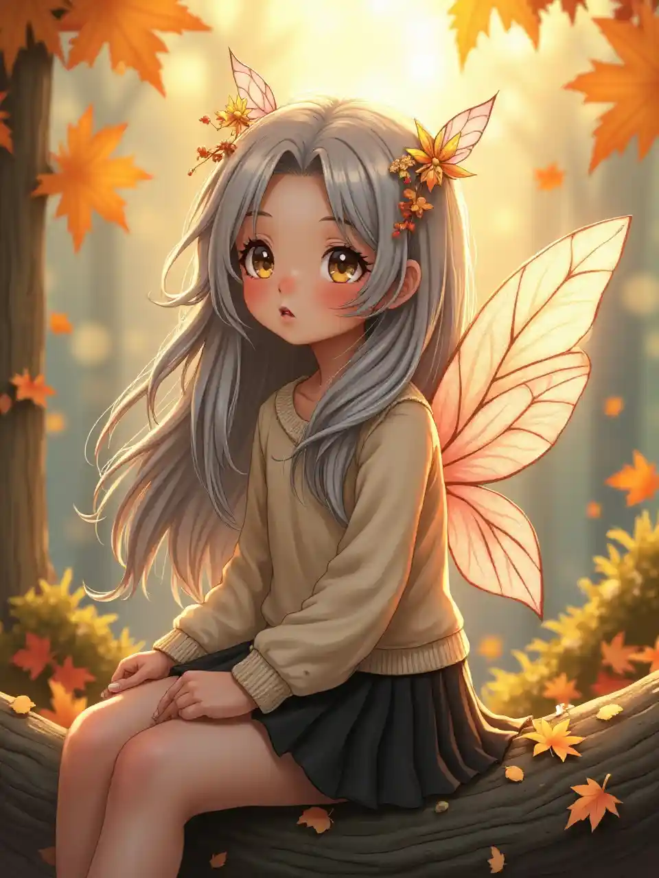 A (((very cute autumn fairy))) with flowing, (((long, wavy grey hair))), dressed in a ((cream pink woolen shirt)) and a ((short, black, pleated skirt)), whose leaves gently sway in the soft breeze. Her wings are like delicate, ((translucent butterfly wings)), with a (pink undertone) that shimmers in the soft light of the setting sun. She sits with her knees crossed and her feet swinging gently as she gazes about with a contented expression. Full body view.