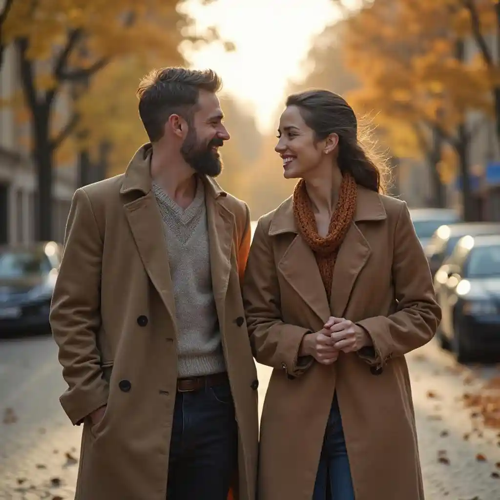A pleasant autumn atmosphere, A man and a woman who are passing by and accidentally meet each other's eyes, They don't know each other but they smile at each other, Have a French autumn theme, They met each other by chance while crossing the street, Have a more artistic clothes, They are far apart