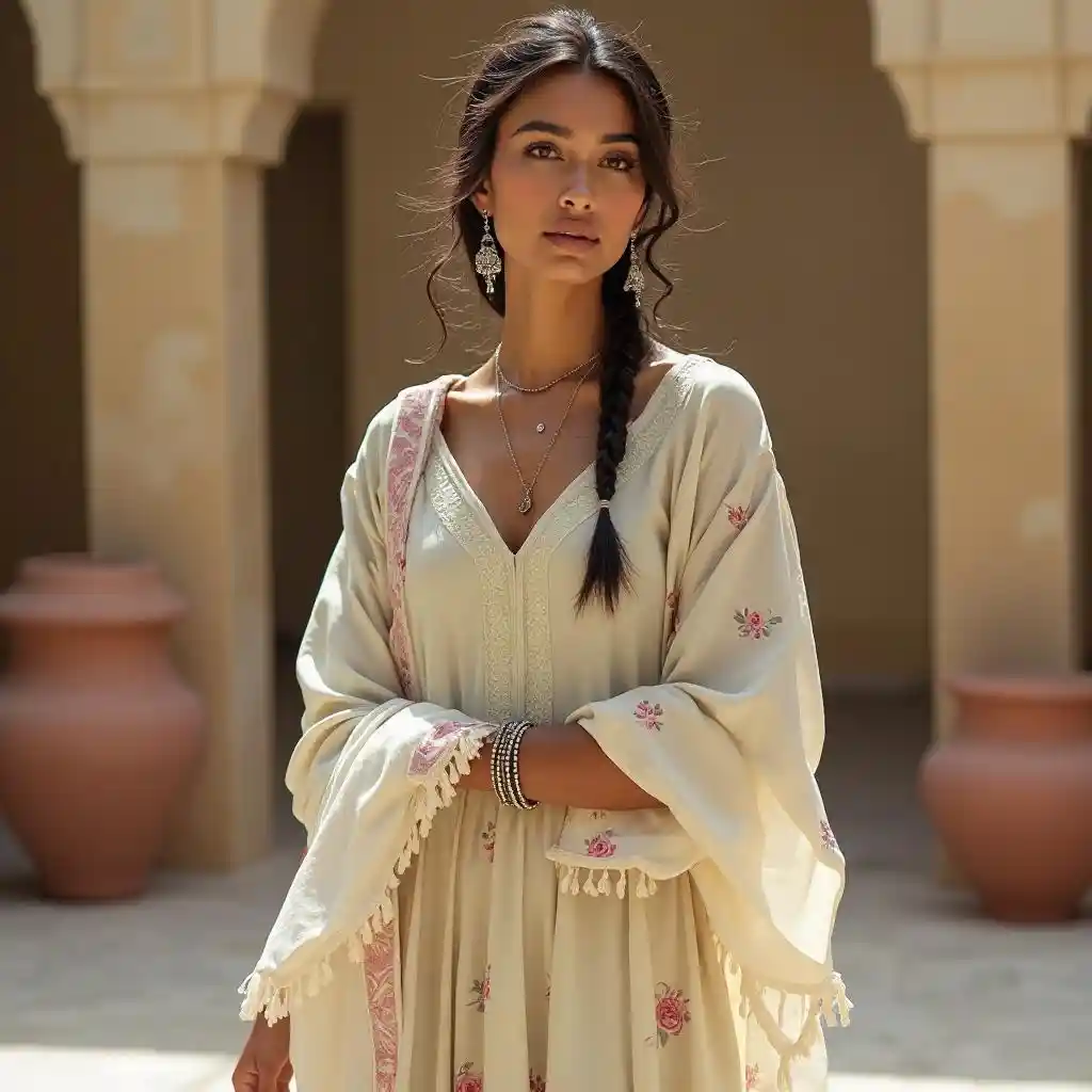 Create an image of an influencer named "Avery Light," styled with a North Indian, earthy elegance that blends traditional elements with a modern, bohemian feel. She has a warm, natural glow to her skin and gentle, expressive eyes. Her hair is styled in a simple, loose braid with a few delicate flowers, such as marigolds or jasmine, woven into it, giving her a grounded, timeless look. Avery wears a comfortable, flowy Anarkali kurta with a subtle A-line silhouette in soft, natural colors like ivory, sage green, or dusty rose. The kurta is adorned with delicate block printing or subtle embroidery in motifs inspired by North Indian artistry, such as paisleys or floral patterns. She pairs this with simple churidar pants or loose, ankle-length pants that add to the boho feel without compromising traditional charm. Over her shoulder, she drapes a lightweight, woven dupatta with simple tassels along the edges. Her accessories are understated: a small pair of silver jhumka earrings, a thin, handcrafted bangle, and perhaps a delicate nose ring to capture a rustic, North Indian essence. The setting is an open courtyard or rustic terrace of an old North Indian haveli, with soft natural light, clay pots, and earthy textures that add warmth to the scene. Avery’s pose is relaxed and thoughtful, her gaze calm and serene, embodying the quiet elegance of North Indian culture with a modern, bohemian touch.