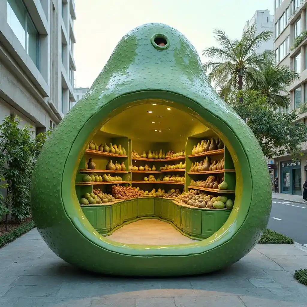 pop up futuristic shop looks like a big avocado, photo from the outside, a lot of avocados are inside the shop, in futuristic shape, super realistic
