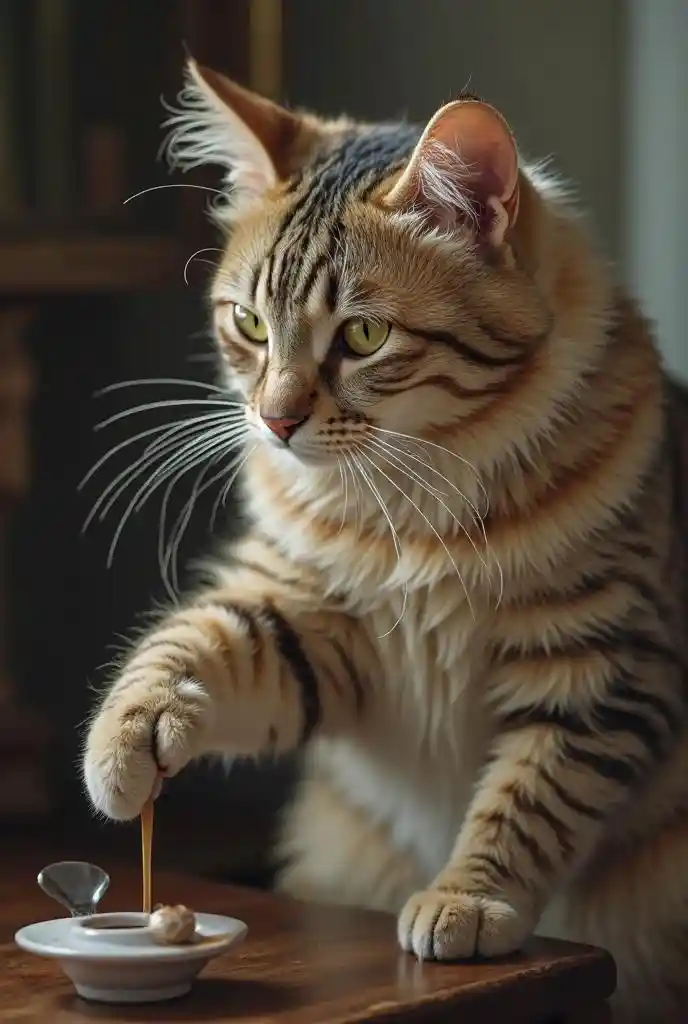 Three-haired cat, I'm siphoning coffee, final details , masterpiece, photorealistic portrait, Award-Winning Photos