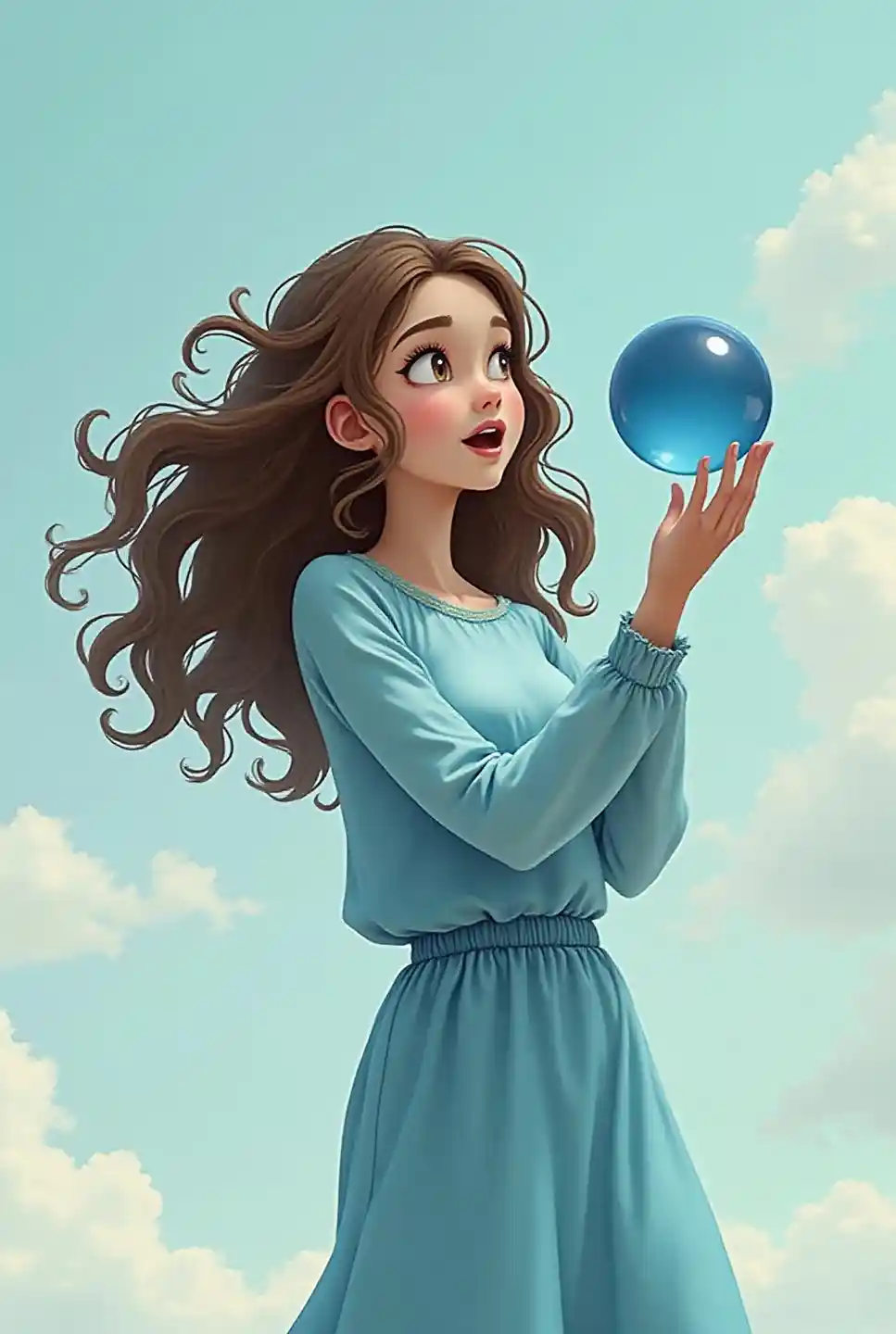 girl with long, with wavy brown hair, About 20 years old , with olive skin and subtle features, expressing awe, holds in her outstretched hand a huge sky blue c