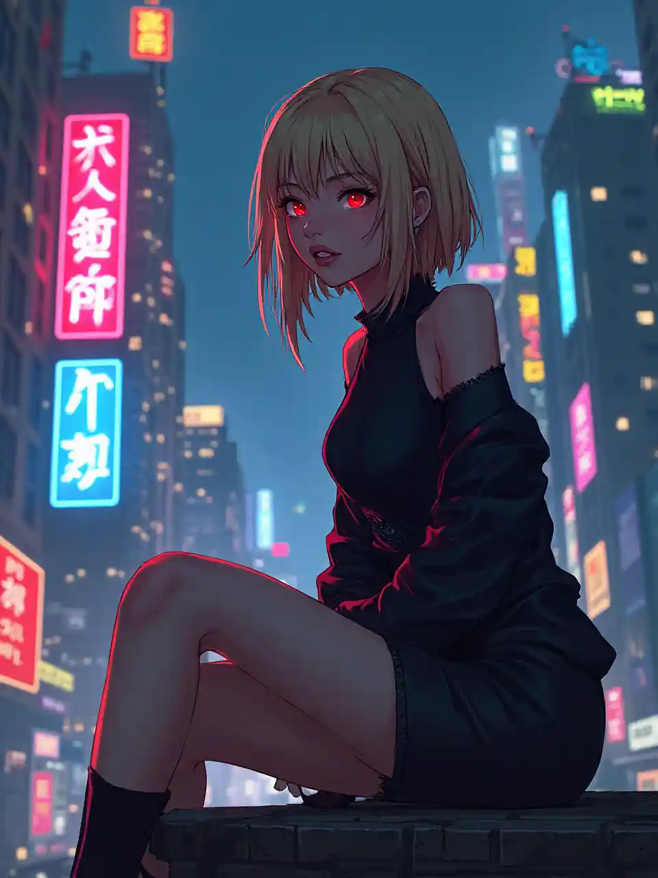 Jocelyn"a woman with blonde hair and red eyes sitting on a ledge in a city with buildings and neon lights, Aya Goda, synchromism, cyberpunk style, cyberpunk art"