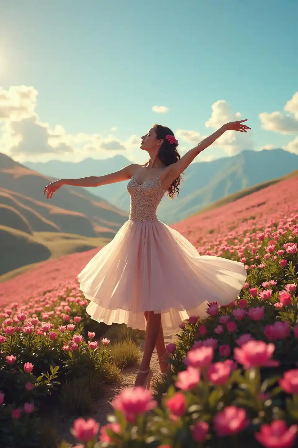 Elegant woman, ballet pose, colorful hill full of flowers, shining lights, High quality digital art, realistic rendering, hyperrealistic, professional-grade, HD