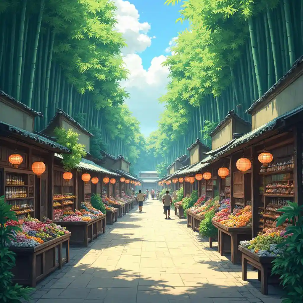 EmeryVibrant marketplace in the heart of a bamboo forest, influenced by traditional anime aesthetics.