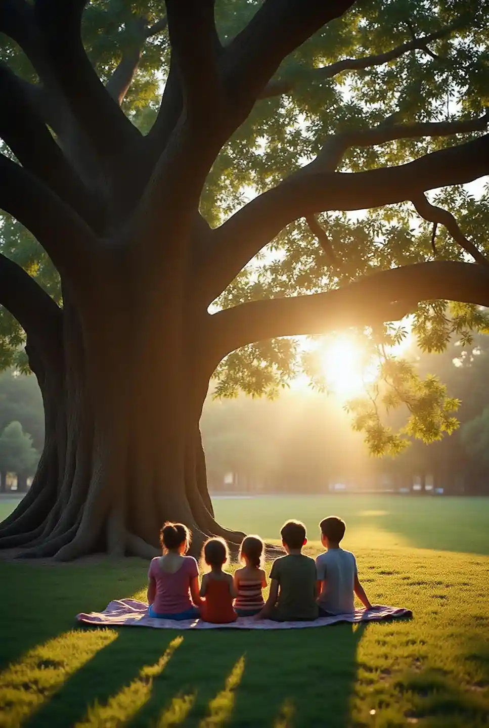 "A wide-angle 4K image capturing the entire family relaxing under the ancient banyan tree as the soft afternoon light begins to fade. The scene shows everyone i