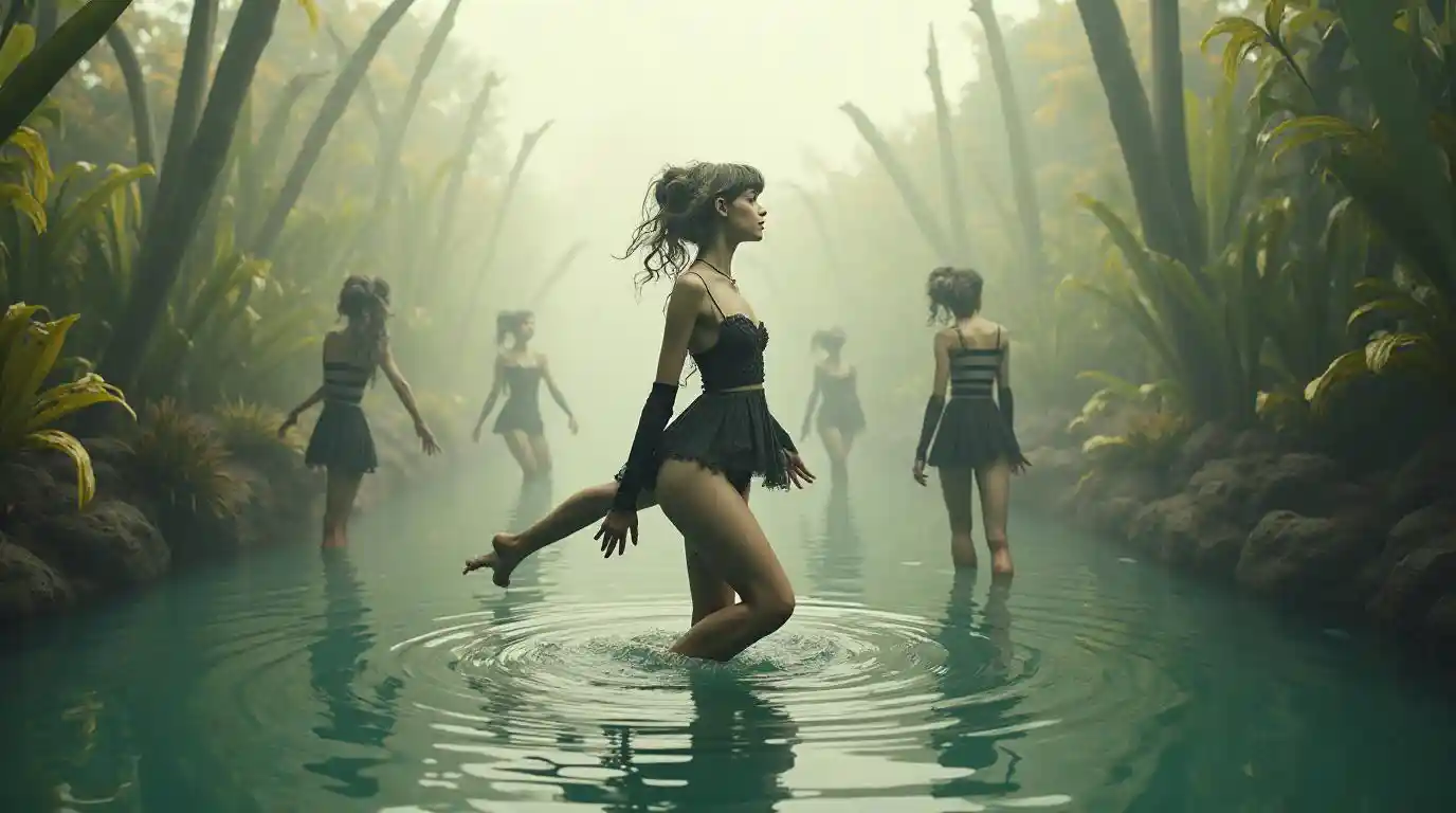 Ethereal humanoid figures in lavish black-and-white baroque attire, adorned with intricate lace and striped patterns, stand amidst a serene, dreamlike aquatic setting, surrounded by soft ripples reflecting their elegant forms. The central figure extends one leg behind while balancing on the other, creating a harmonious line from fingertips to toes, as arms extend for balance. Whimsical, stylized leaves and plant silhouettes tower in the background, infusing the scene with fantasy and imagination. The setting is illuminated by soft, golden light, casting a cinematic glow reminiscent of the works of epic filmmakers like Terrence Malick, Andrei Tarkovsky, and David Lean. The image exudes a sense of wonder, playfulness, and artistry, blurring the boundaries between reality and fantasy. Captured with the gritty texture of 35mm film, the scene is suffused with grain, nuanced color grading, and the subtle vignette of a masterfully composed cinematic still, evoking the majesty of a bygone era of filmmaking. Cinematic film still, shot on v-raptor XL, film grain, vignette, color graded, post-processed, cinematic lighting, 35mm film, live-action, best quality, atmospheric, a masterpiece, epic, stunning, dramatic"