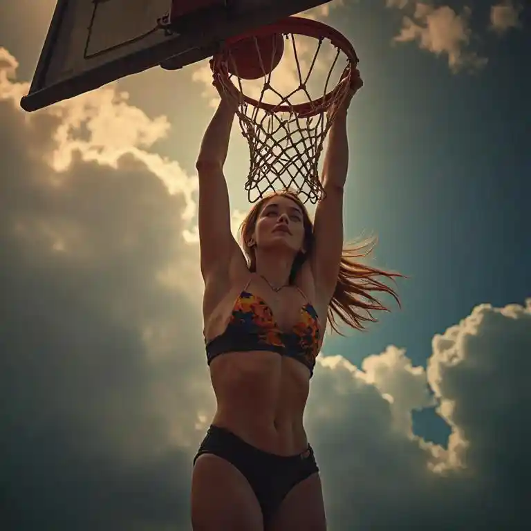 8K, RAW photo, highest quality, masterpiece, create a fantasy art image of a gorgeous busty woman (basketball player) hanging from a basketball hoop, best angle