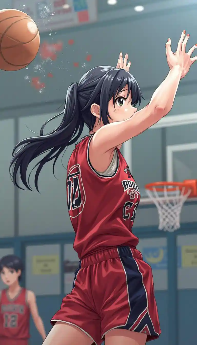 Lukeshooting in front of goal,black hair, black eyes,1 person,dynamic composition,sweat,ponytail,red basketball uniform,Japanese high school girl playing basketball