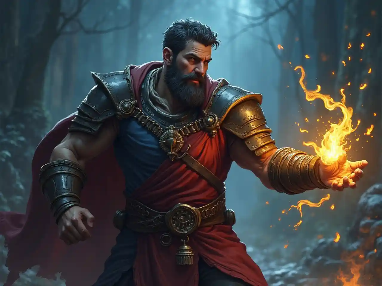 (torso) Male stocky large 38-year old battle-mage with short hair and beard, engaged in combat casting an magical shield-spell, villiage under attack at night, in movement, pathfinder, d&d setting, realistic, enhanced shadow quality, colorful