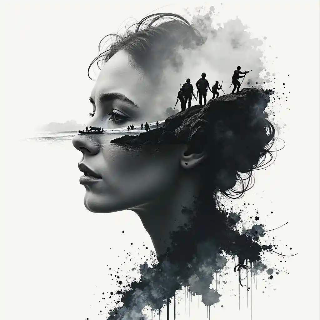 A surreal double exposure artwork blending a black-and-white portrait of a woman's face with a dynamic battle scene, where soldiers and rocky coastlines replace the upper half of his head. The composition features abstract ink splatters and brushstrokes, merging seamlessly into the battle imagery. The style is minimalist, artistic, and evocative, with a focus on emotional depth and contrast