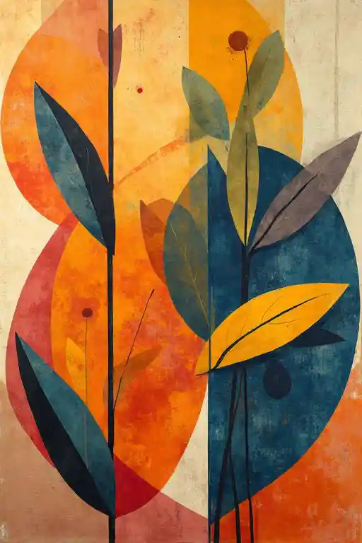 Audreyvery awa, newest, colorful, bauhaus, abstract painting ,geometric art, simple lines, pure color blocks, leaves, nature, play of lines and angles forming a lea