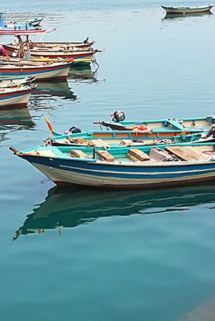 A tranquil bay with colorful fishing boats anchored, their reflections mirrored in the still water.