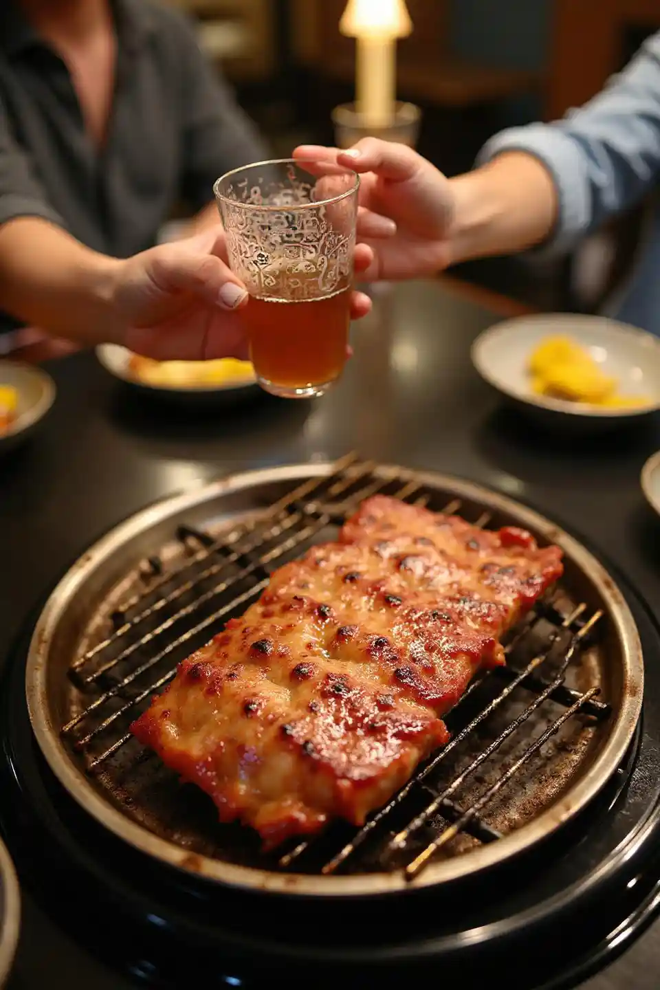 SebastianWhile grilling Korean-style pork at a Korean restaurant, I'm holding a Korean-style soju cup, shouting a toast with others, and holding a glass high.The sight o