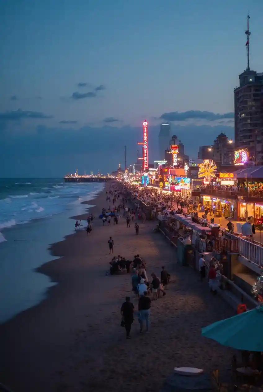 A bustling boardwalk beside a tranquil beach, with carnival lights twinkling at dusk.